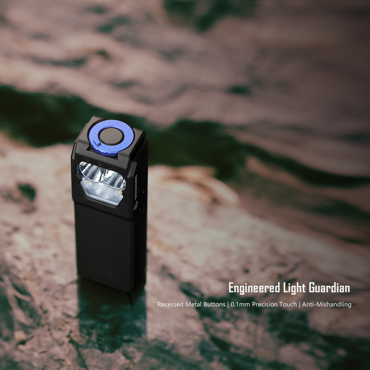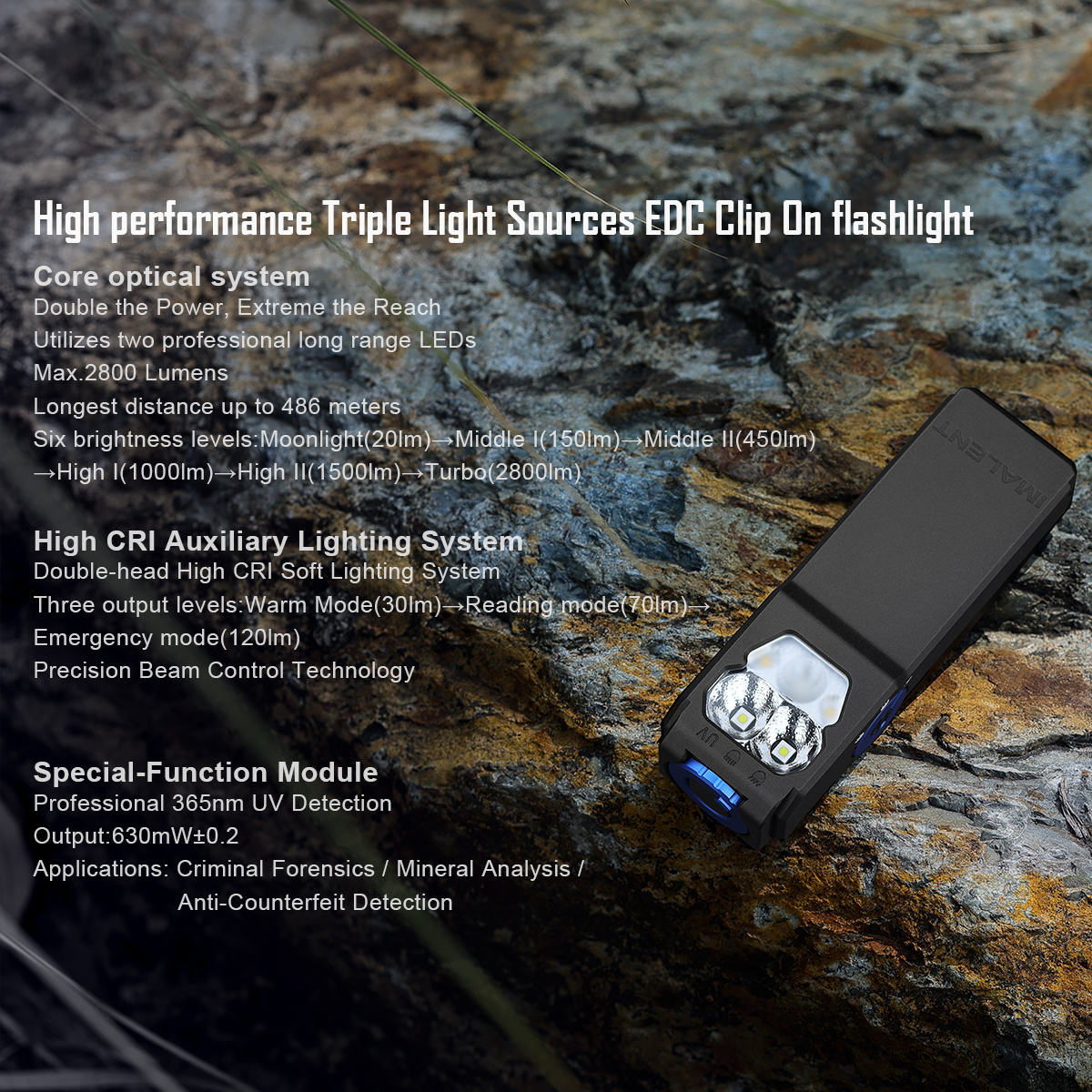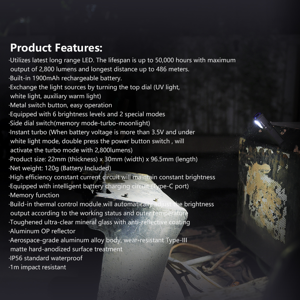 ·Instant turbo (When battery voltage is more than 3.5V and under white light mode, double press the power button switch , will activate the turbo mode with 2,800lumens)
