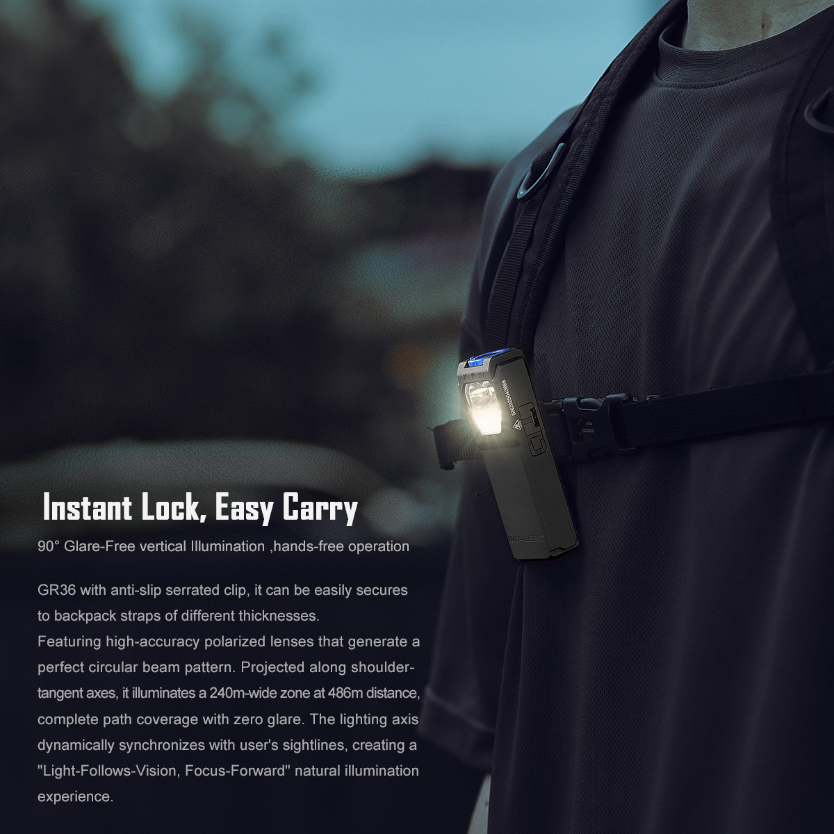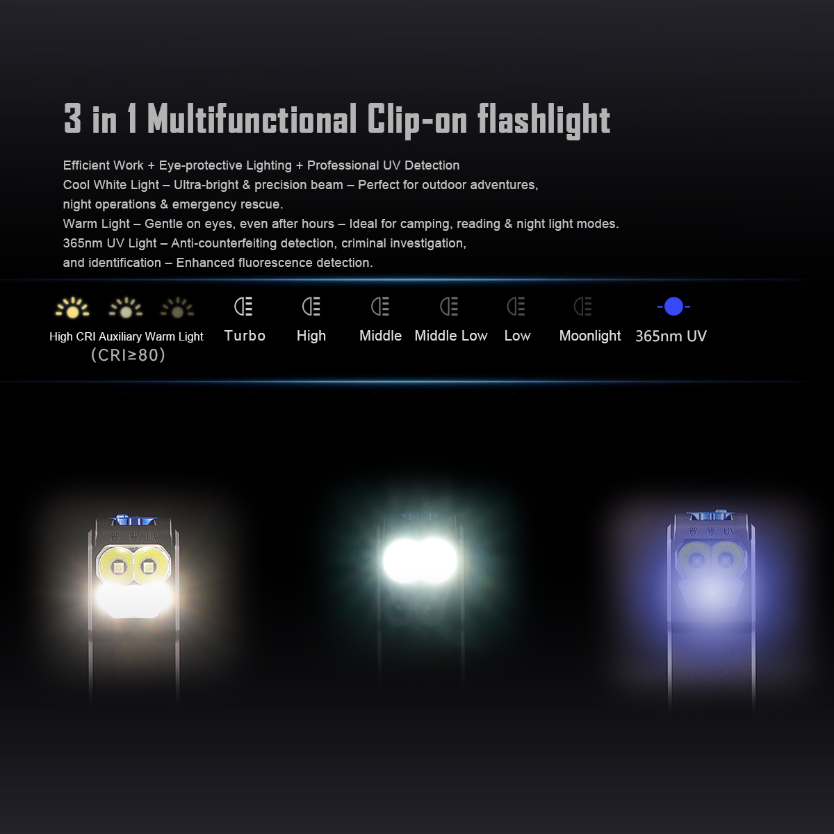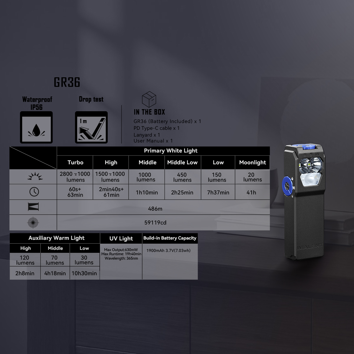 ·Instant turbo (When battery voltage is more than 3.5V and under white light mode, double press the power button switch , will activate the turbo mode with 2,800lumens)