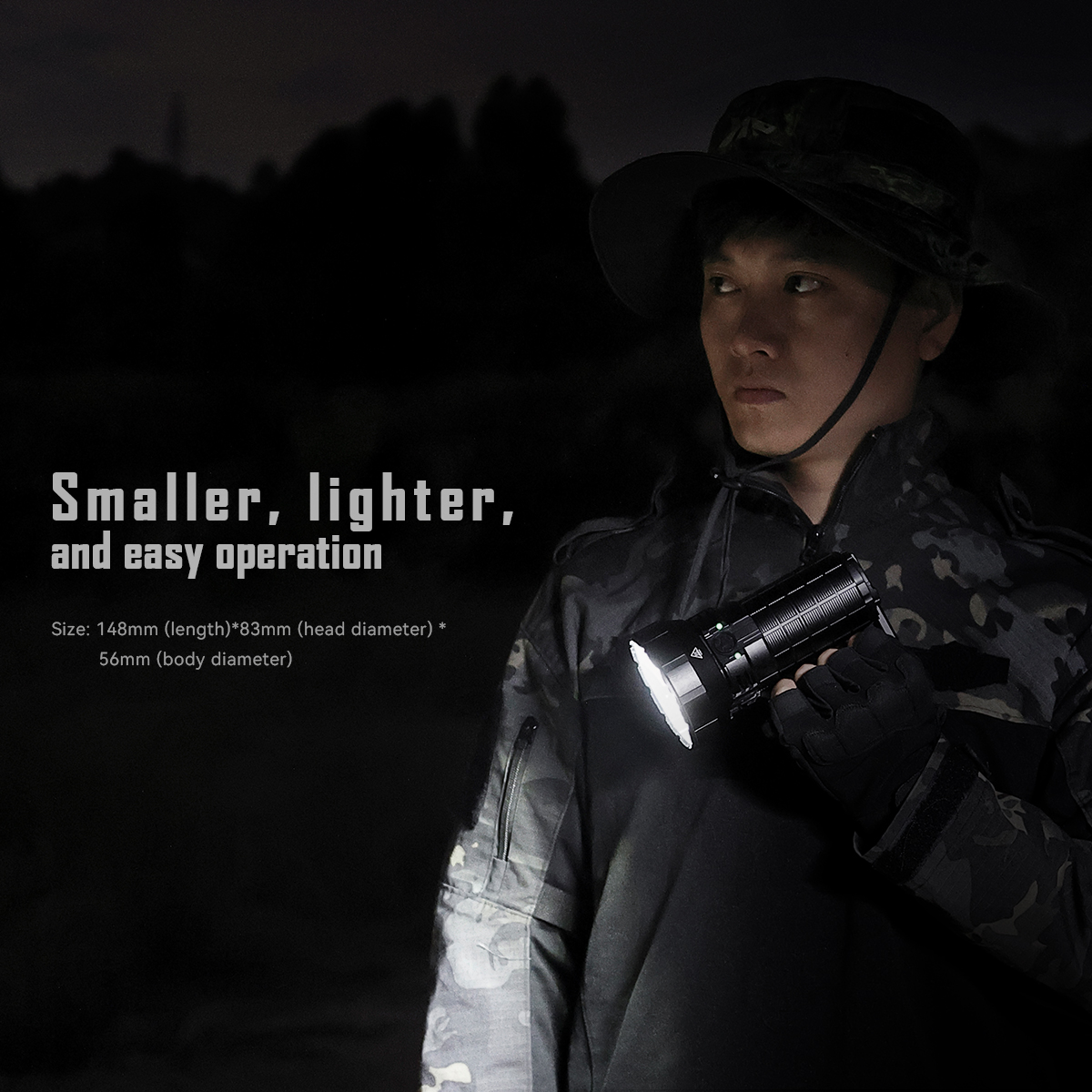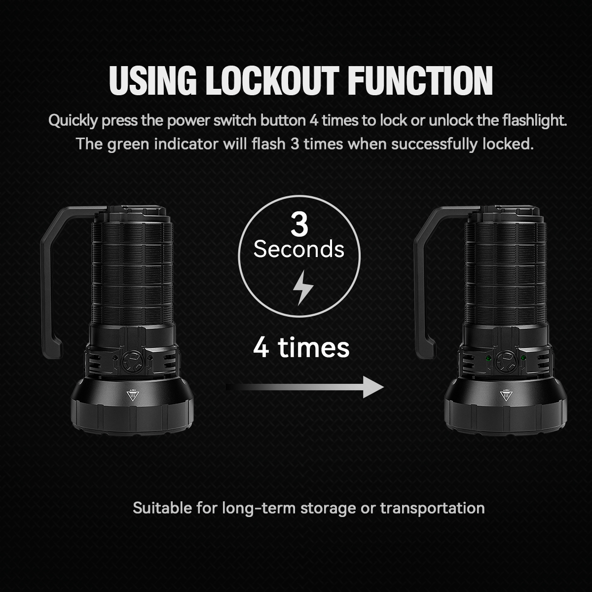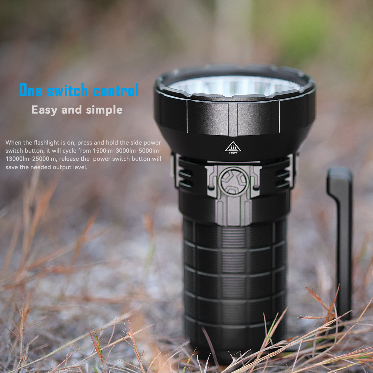 - Instant turbo output by double press the side power switch button while triple press the side power switch button, can get moon mode 50Lumens.